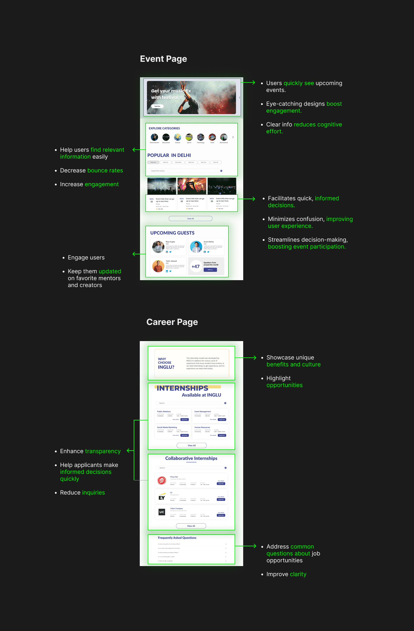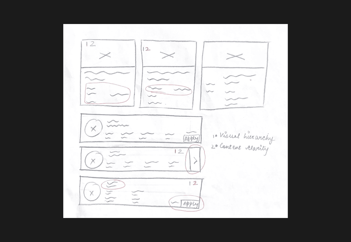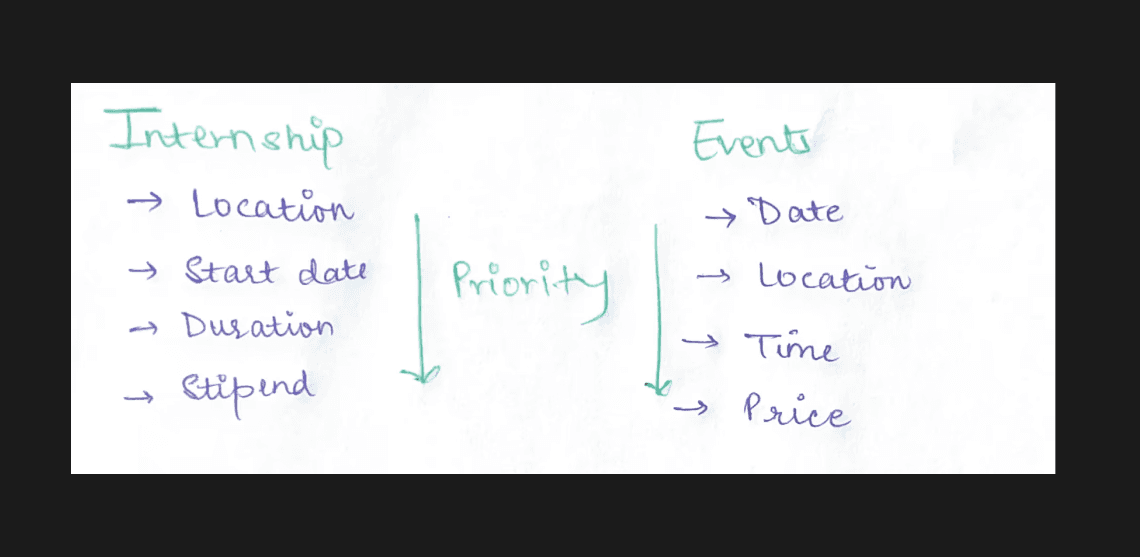 My team and I brainstormed how to deliver relevant information to users. For career enthusiasts, this meant detailed internships, and for event-goers, pertinent events. Initially, we considered using only cards without a search bar and categorization, thinking it would suffice with few listings. However, I realized users needed more autonomy. Ultimately, we decided to provide categorizing along with a search bar for sorting and filtering.