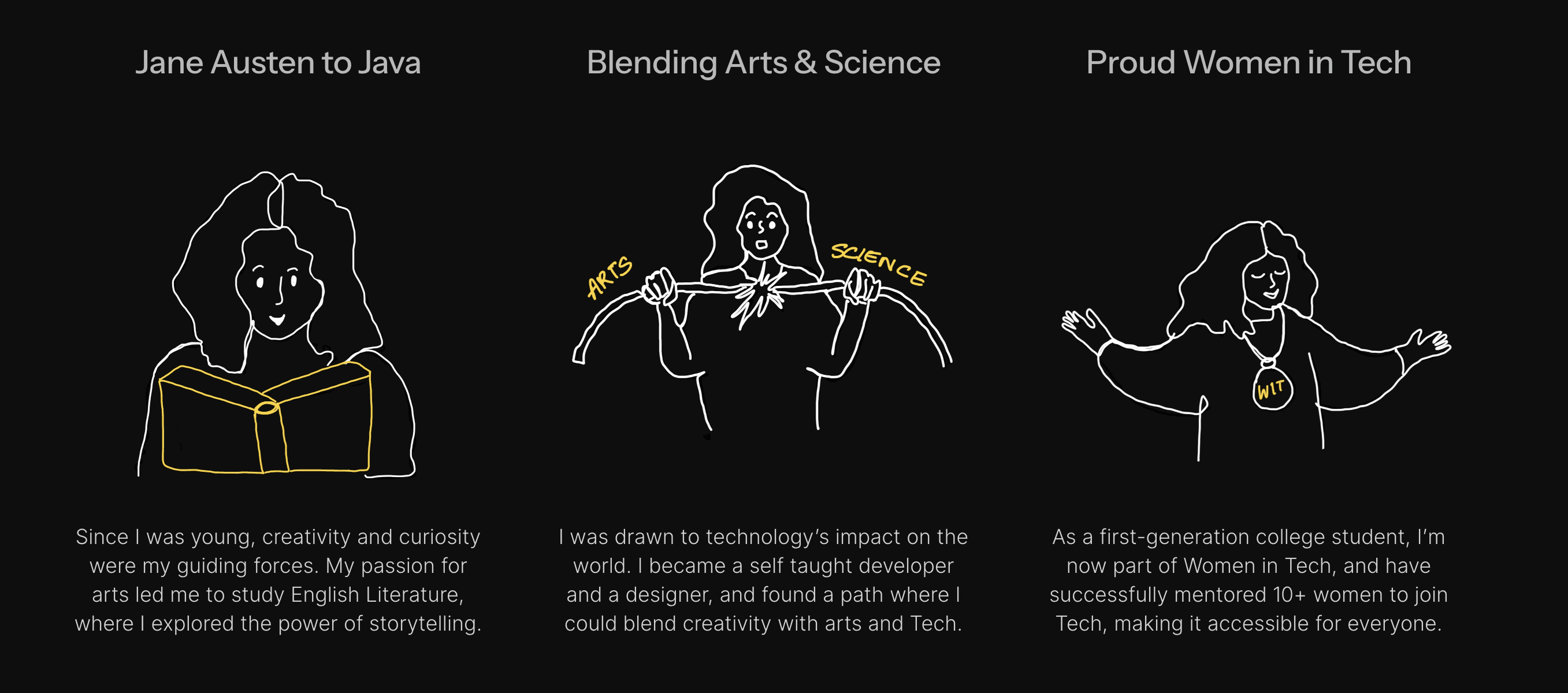 I was drawn to technologyโs impact on the world. I became a self taught developer and a designer, and found a path where I could blend creativity with arts and Tech.