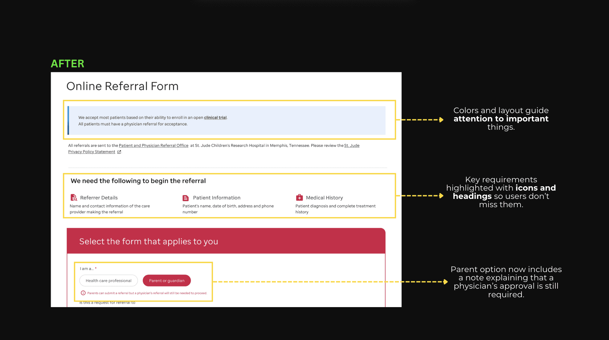Users often skipped key details leading to unqualified referrals, so I improved the information architecture and visual cues which made critical information clear and increased referral approvals.