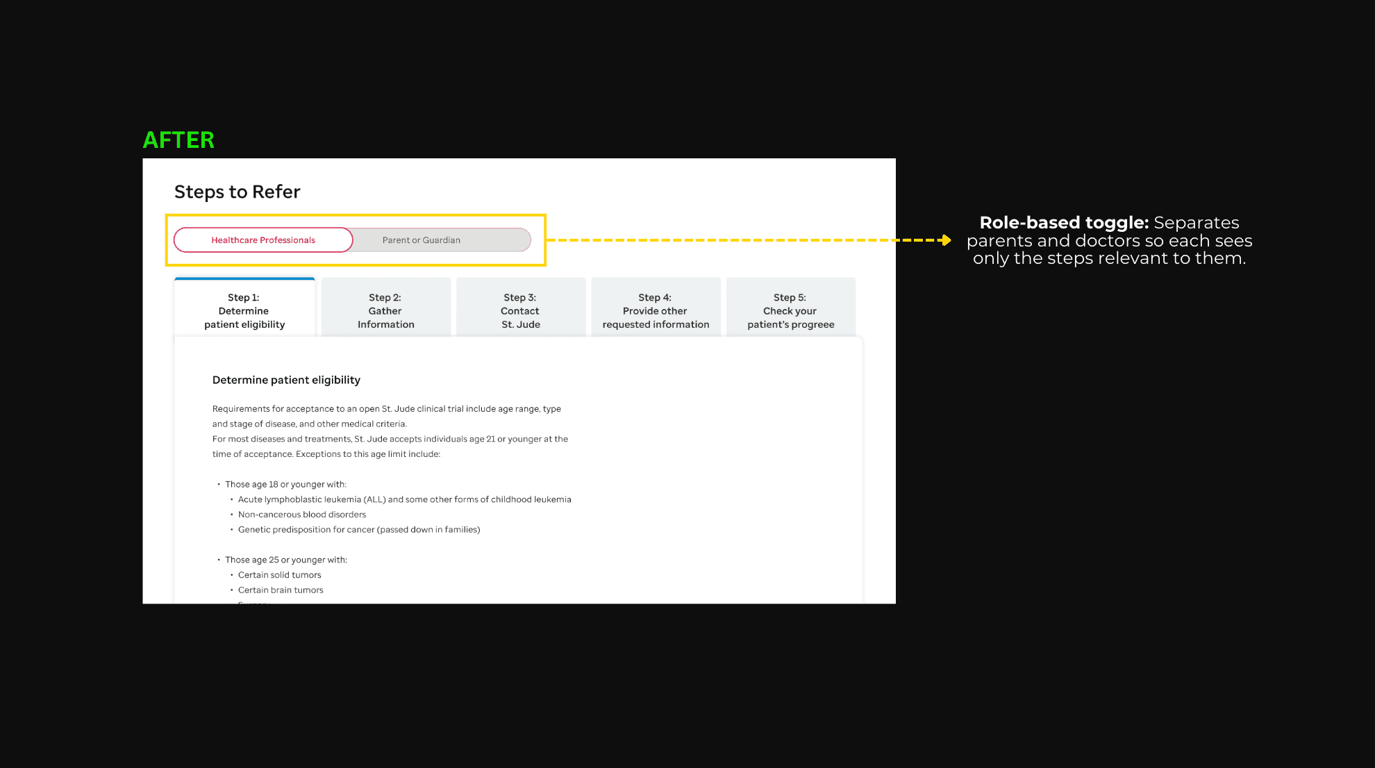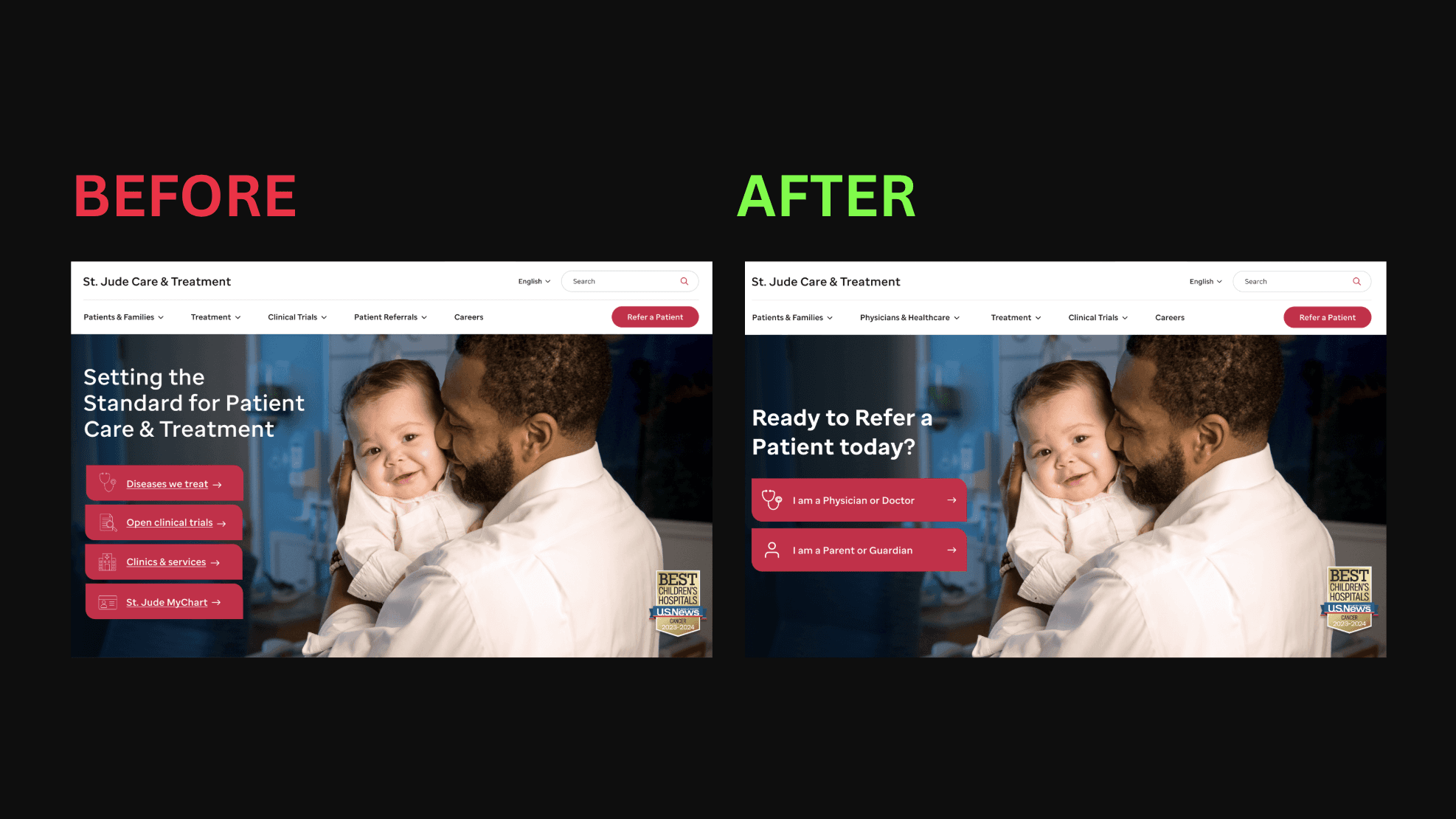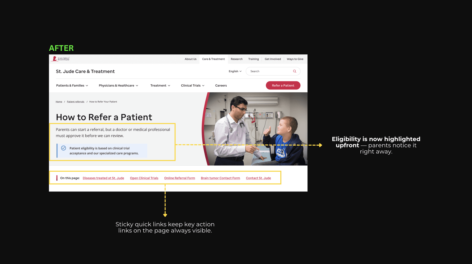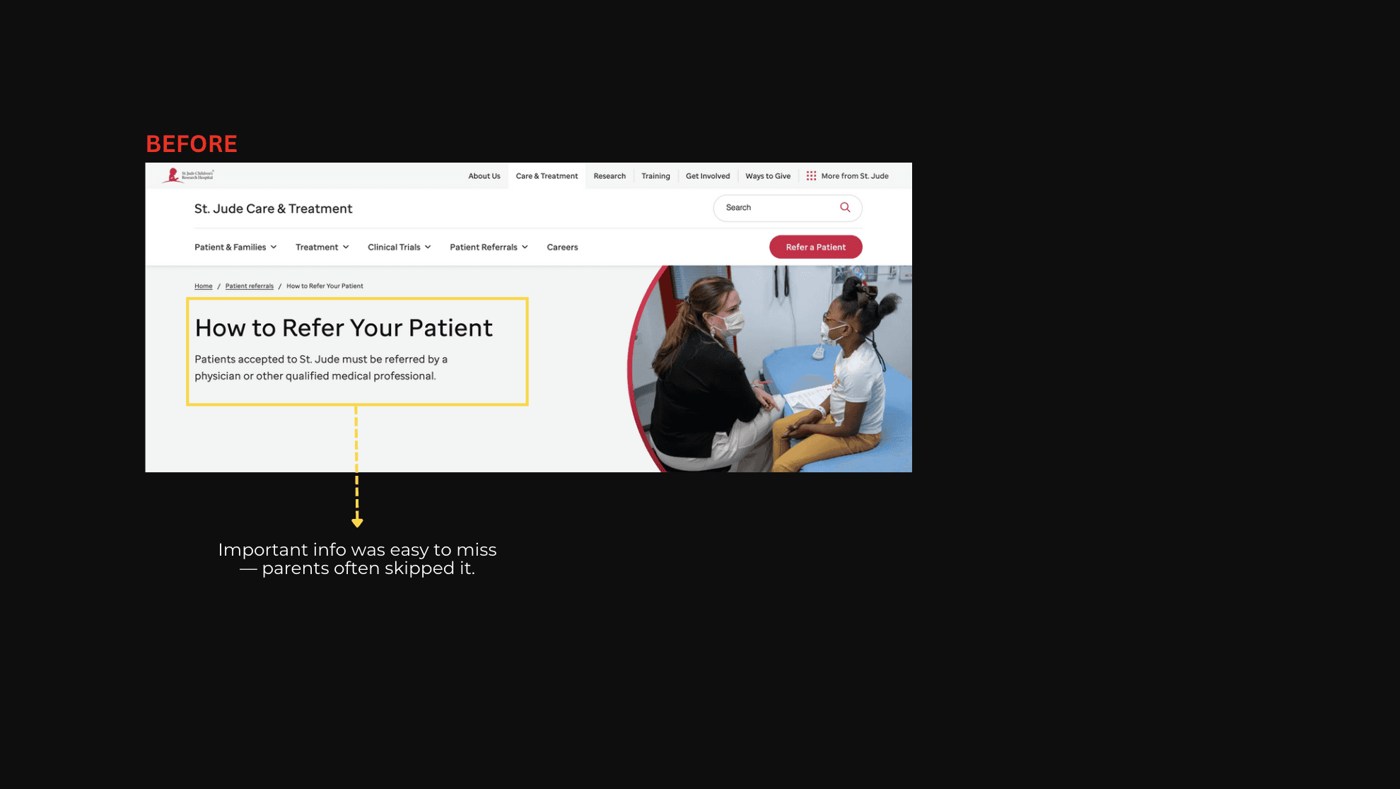 Parents who clicked the “Refer a Patient” CTA were taken to a physician-focused page instead of a parent-friendly flow. This caused two main issues: