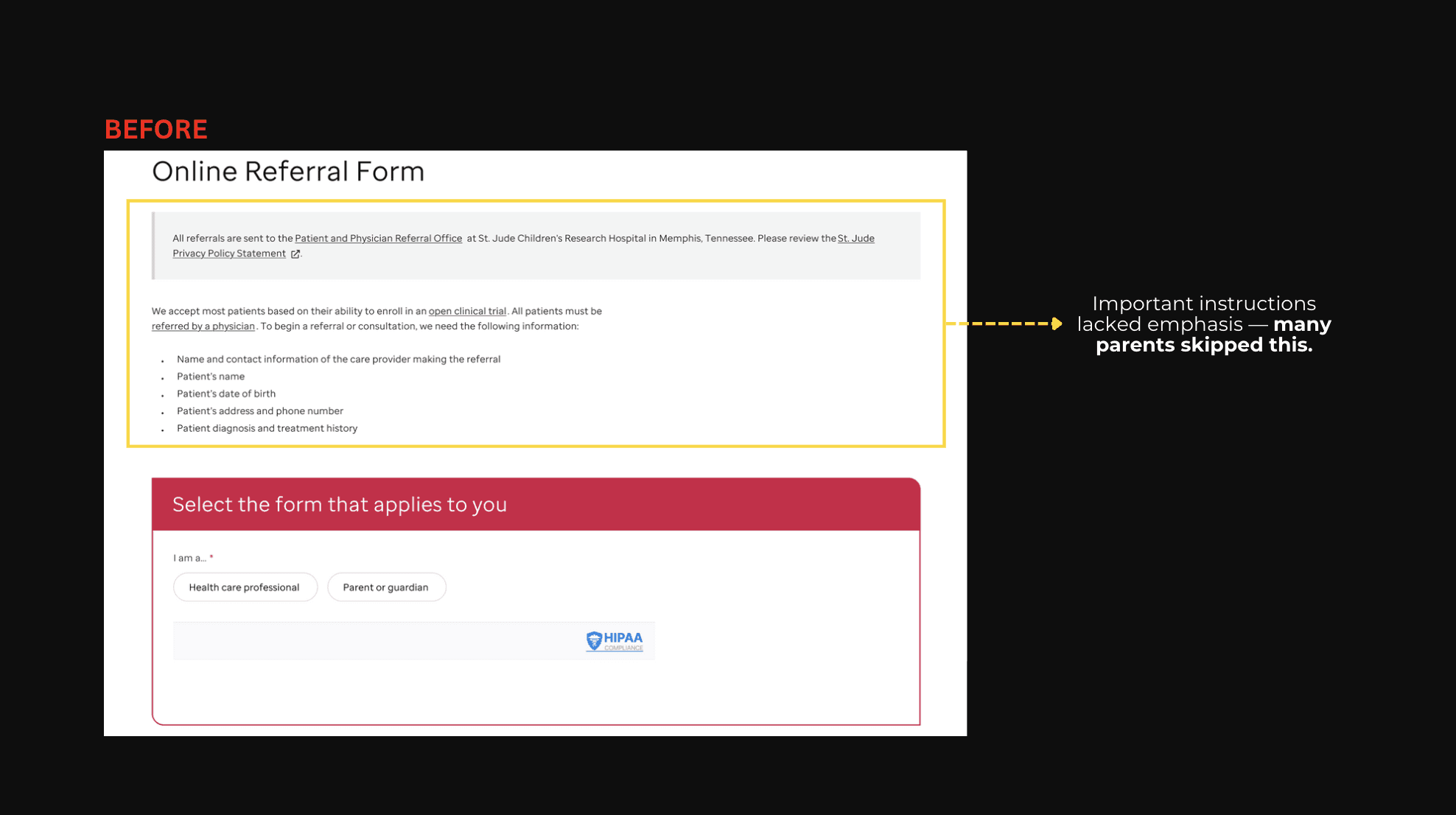 In the old referral form, important instructions were easy to miss, roles were unclear, and missing features made it hard to submit. This caused parents and doctors to skip details or leave the form incomplete.