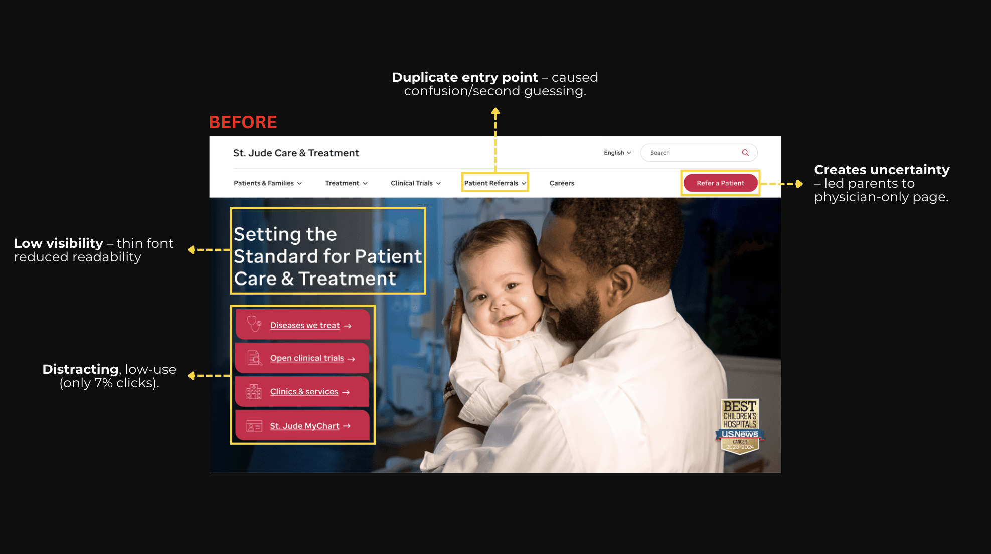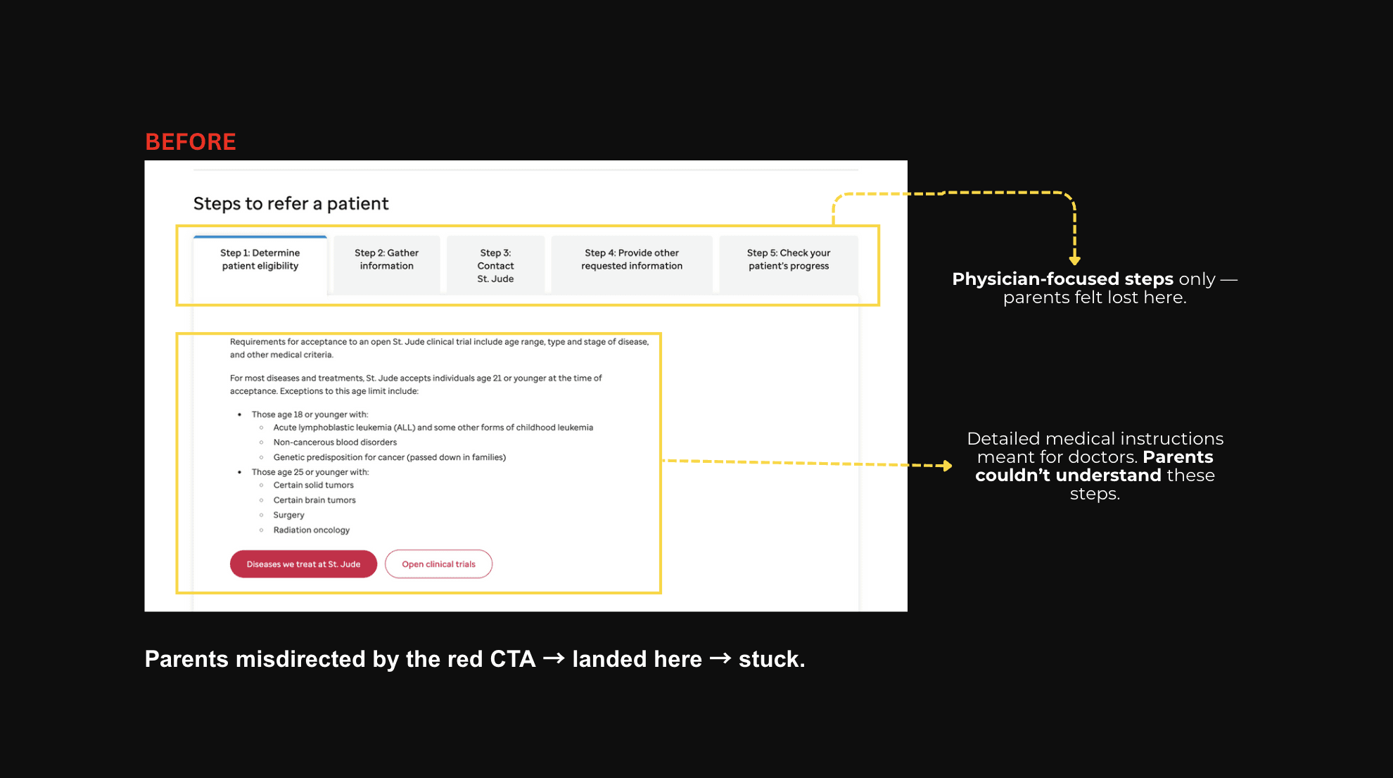 Parents struggled to find the correct referral path because of duplicate CTAs, unclear labels, and poor readability. Key information was missed, and attention was diverted by a stack of low-use red buttons.