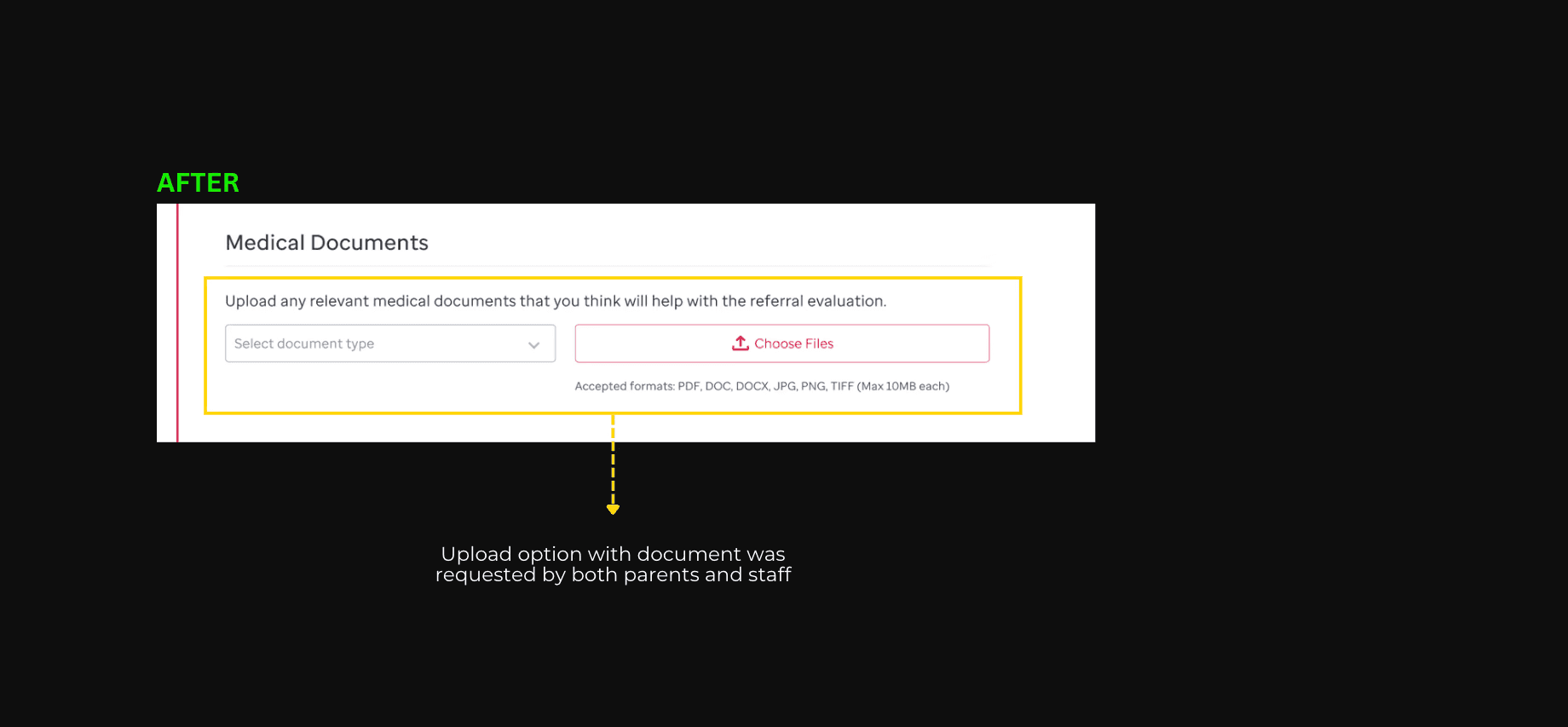 One big problem was the form didn’t have a document upload option, which both Parents, Healthcare workers and even the Patient Referral Office really wanted.