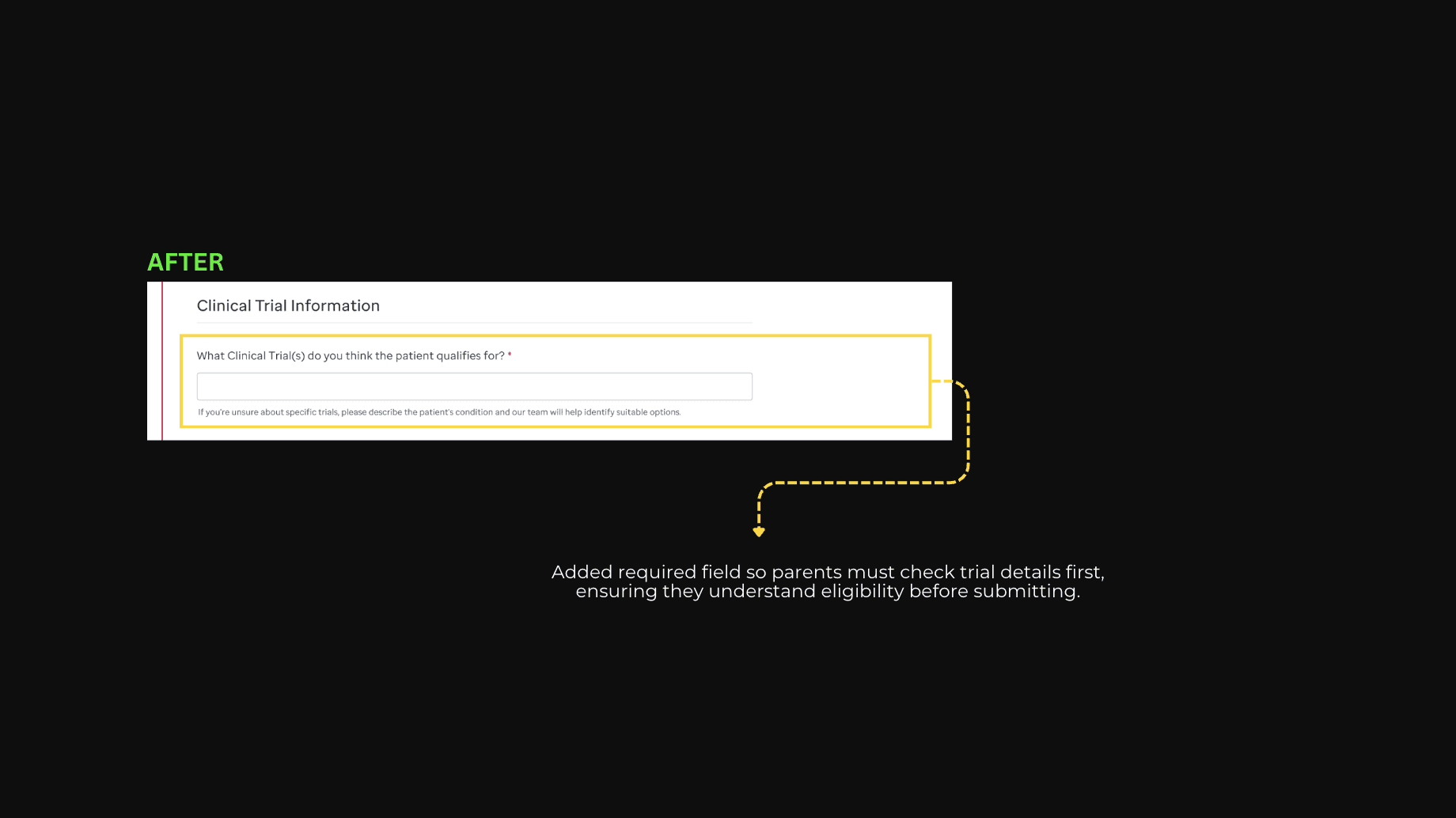 To address this, I introduced a required Clinical Trial Information field, ensuring eligibility is reviewed before submission and improving approval rates.